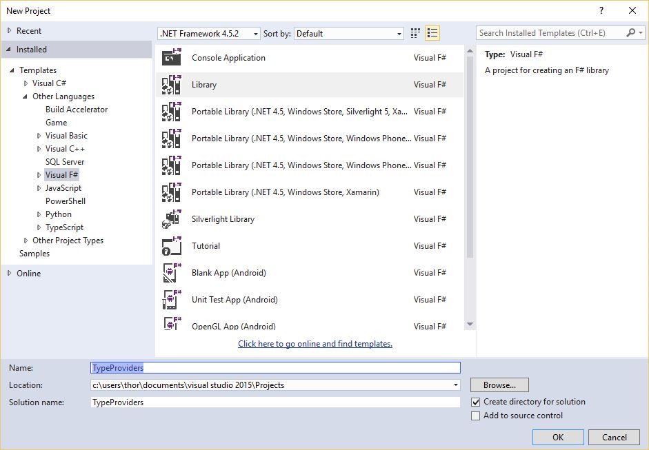 A picture of the new project dialog in VS 2015.  We're using an F# library project and calling our project TypeProviders.