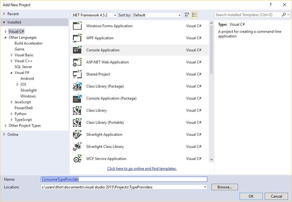 A picture of the NewProject window, with a CSharp console project selected, and the name ConsumeTypeProvider.